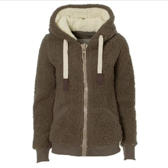 Full Zip up with Side Pockets Hood Drawstring Thick Lamb Wool Winter Hoodie