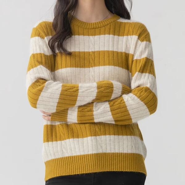 Womens Round Neck Loose Striped Cashmere Pullover Sweater